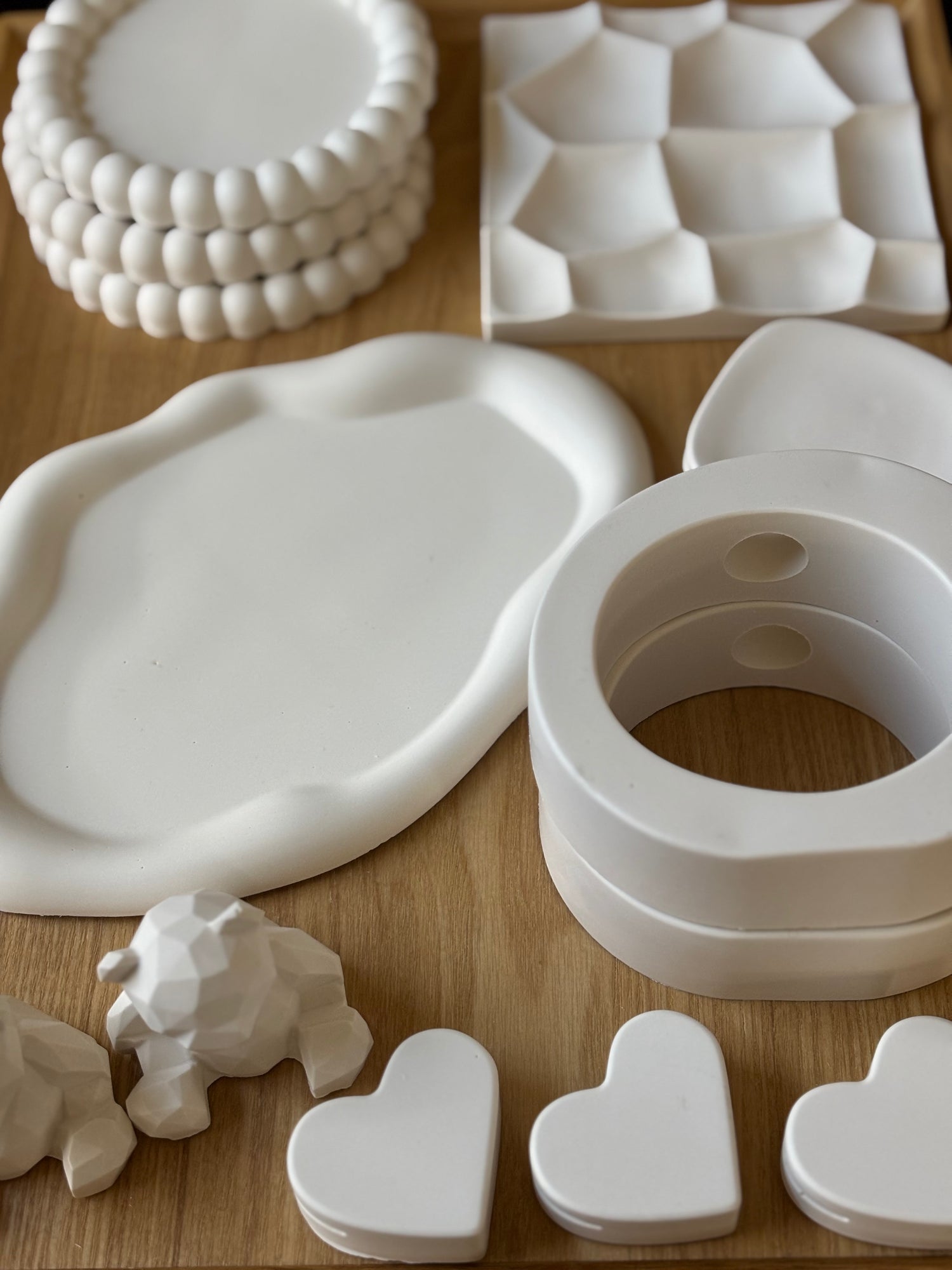 Some may show air bubbles, small chips, or subtle marks from the making process. Others carry softened details, a bear’s tail or a leaf rim gently refined after a delicate part broke during demolding. A few may bear faint traces from being used as display samples or photo props.