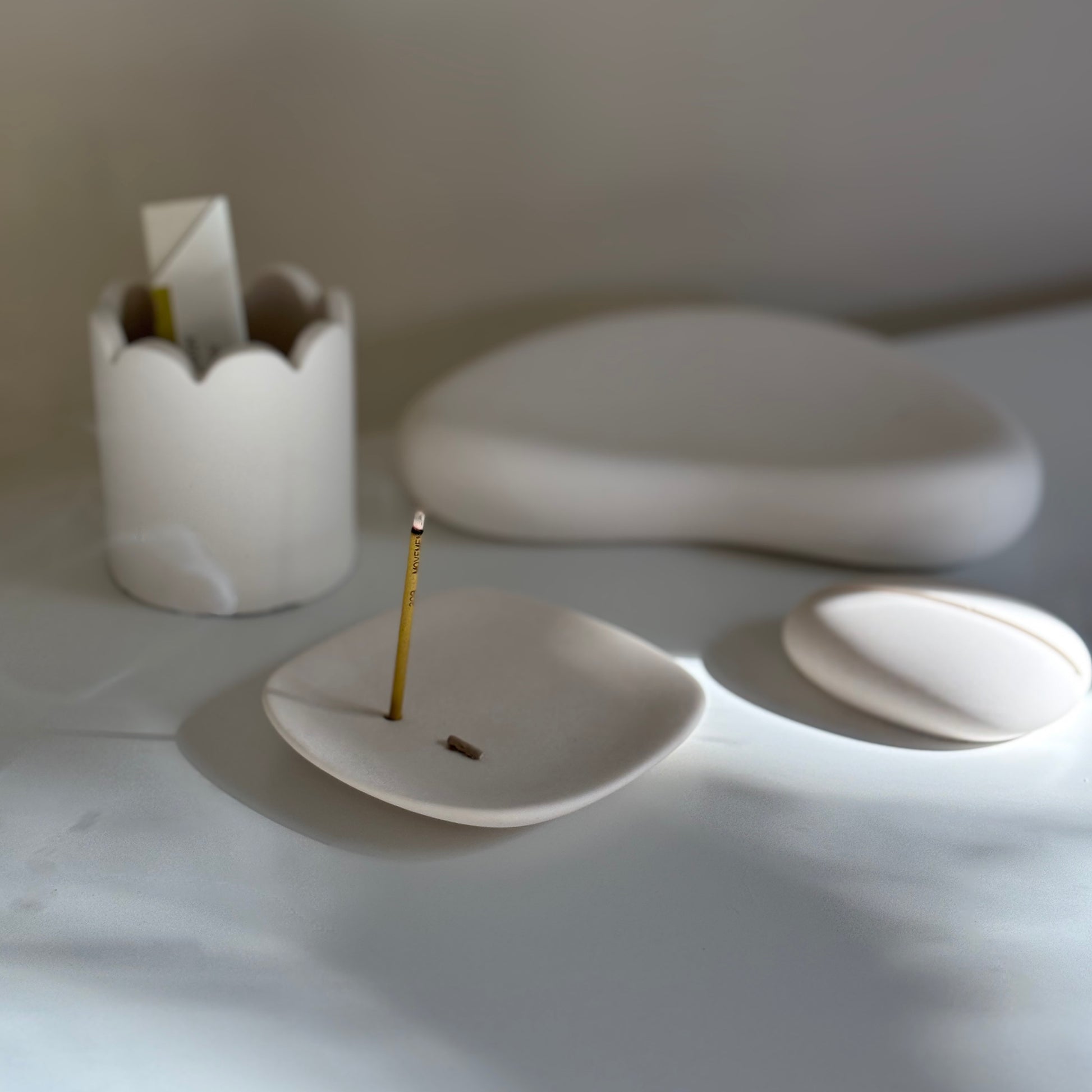 A quiet shape, a soft rhythm. Ray is a minimalist incense holder designed to bring gentle focus and calm to your daily rituals. Its petite, rounded-diamond shape fits seamlessly into small spaces—ideal for short incense sticks or accenting a quiet corner.