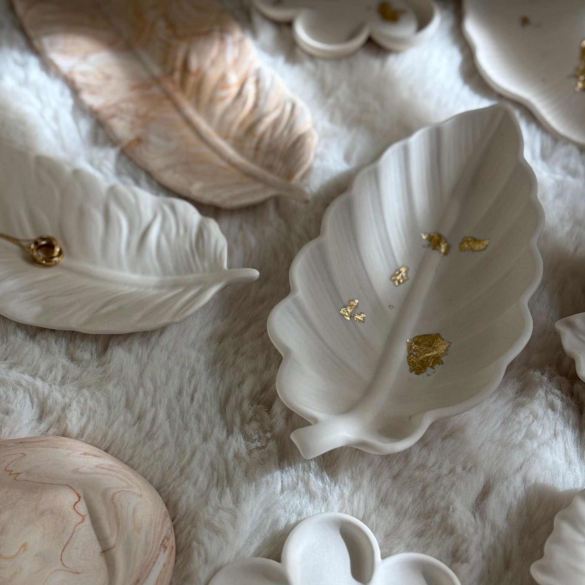 Shaped like a gently rustling leaf in the wind, the Rustle Tray brings a sense of motion and seasonal stillness to your space. Its flowing curves and gentle ridges create a calm resting place for your favorite jewelry, small trinkets, or keys. The gold leaf variant adds a luminous, festive glow, perfect for seasonal styling or meaningful gifting.
